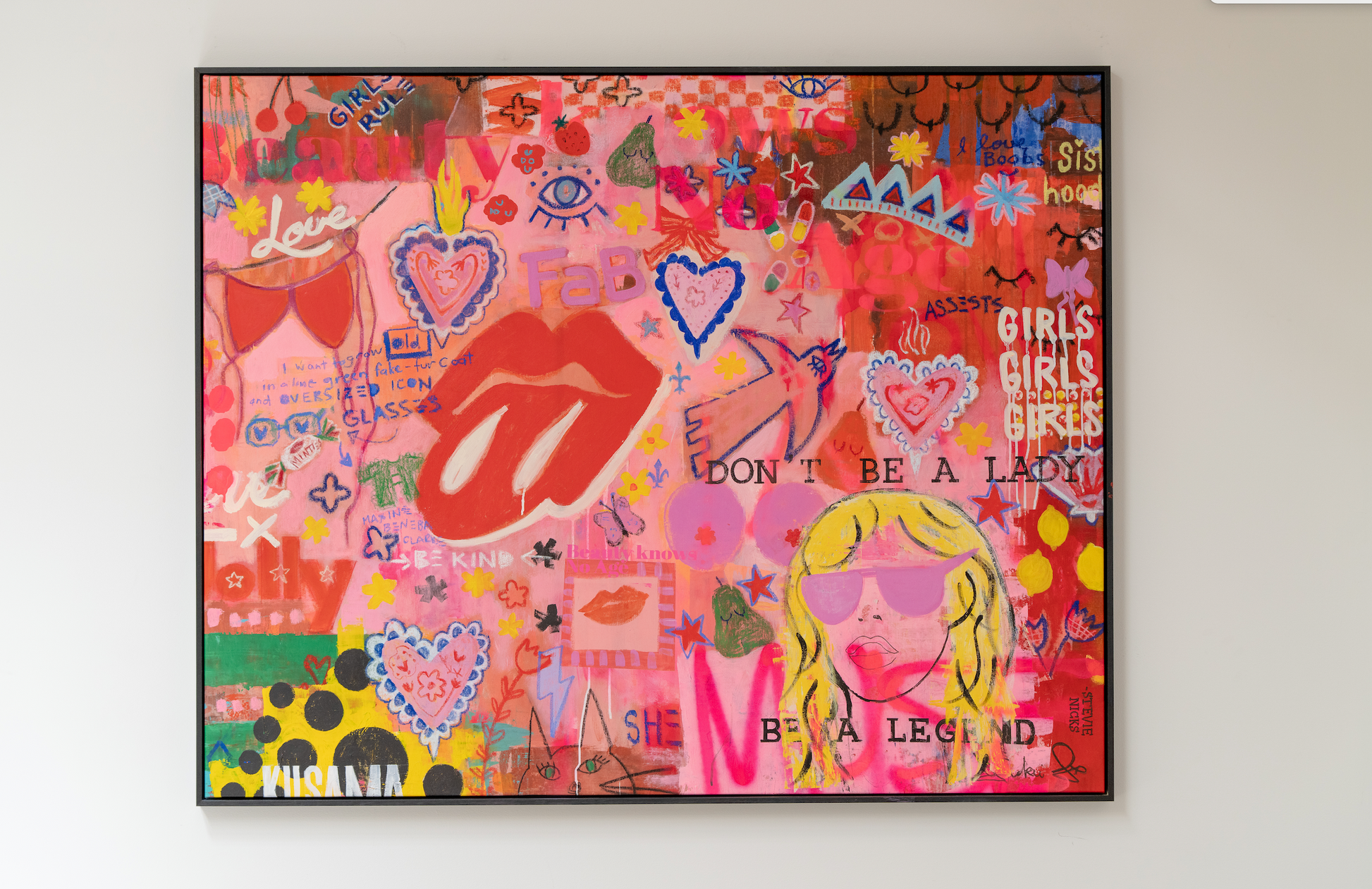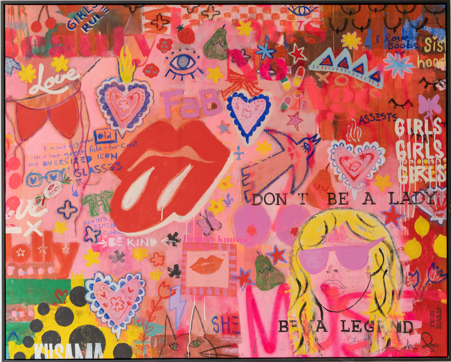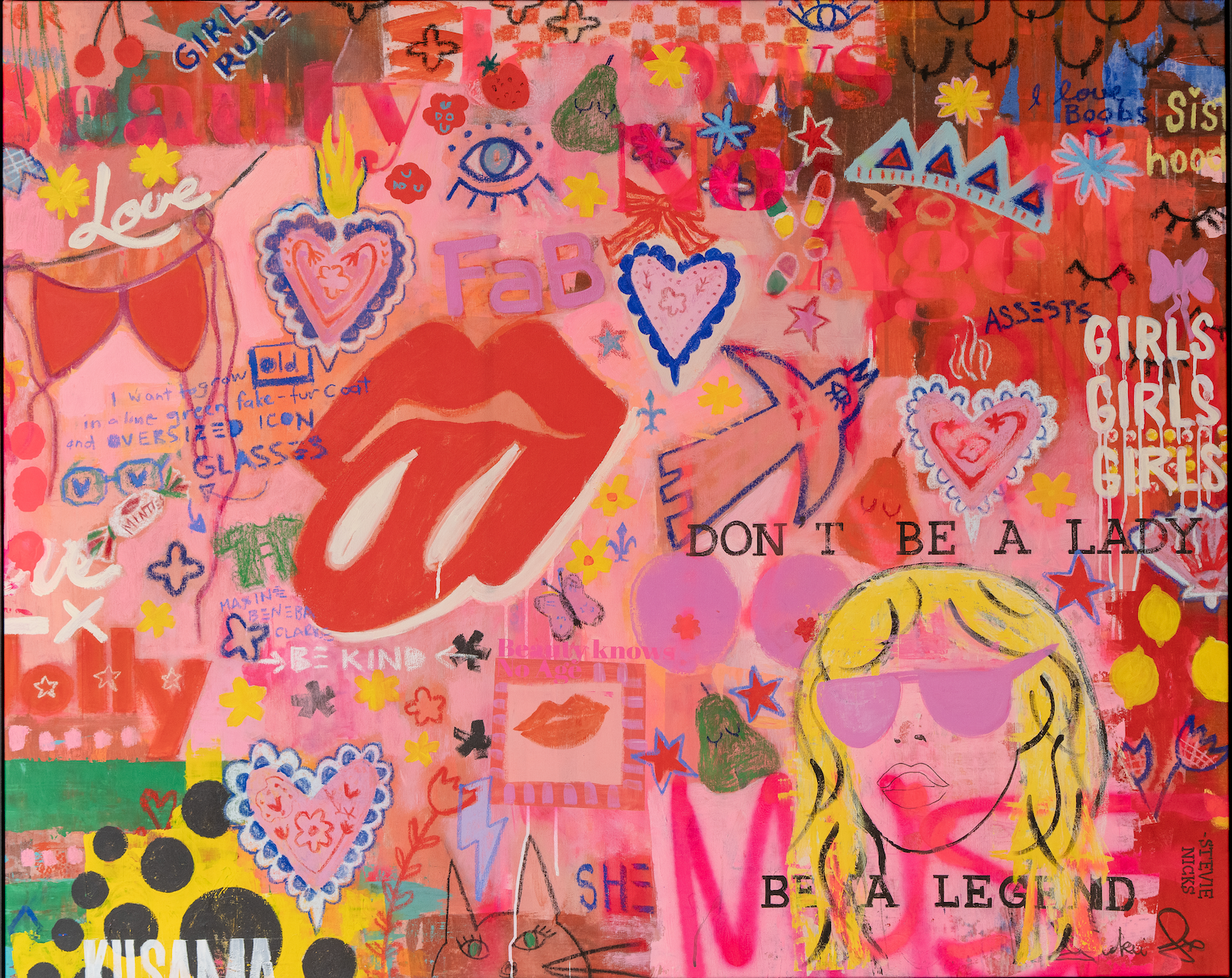 The message is simple: believe in yourself, go for it, and don’t let anything stop you from being who you are. Be proud of it: “I want to grow old in a lime-green fake-fur coat and oversized icon glasses” - Maxine Bemeba Clarke. She’s a modern girl - seventies to now - forever young at heart and the strongest yet. A full collage of everything tied to girlhood and girl power. A mix of Stevie Nicks’ “don’t be a lady, be a legend,” blended with TAB (FAB), iconic Aussie brands, Elle McPherson, She magazine, feline energy, and the celebration of the body, breasts included. It’s sisterhood, it’s being topless, it’s being a free spirit. – Jackie Green