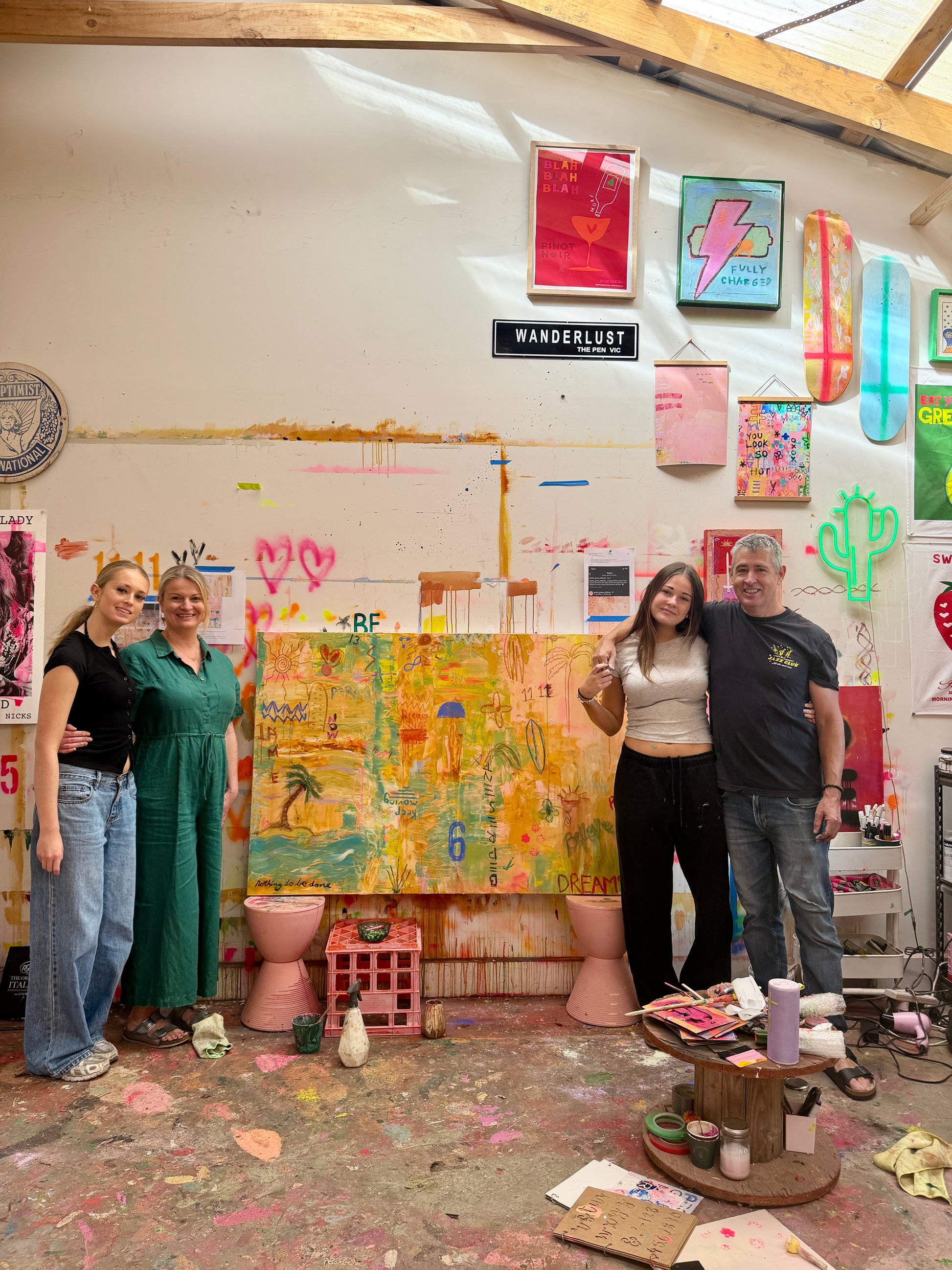 We begin by painting the foundation layer together, with Jackie guiding you through her techniques using squeegees, brushes, and spray paint, encouraging you to let yourself go with the flow (literally!) and enjoy colour, spontaneity, and the kind of fun that springs from creative joy. Through random questions and playful prompts, Jackie brings her expertise to help you create a phenomenal artwork that is deeply personalised and completely unique.